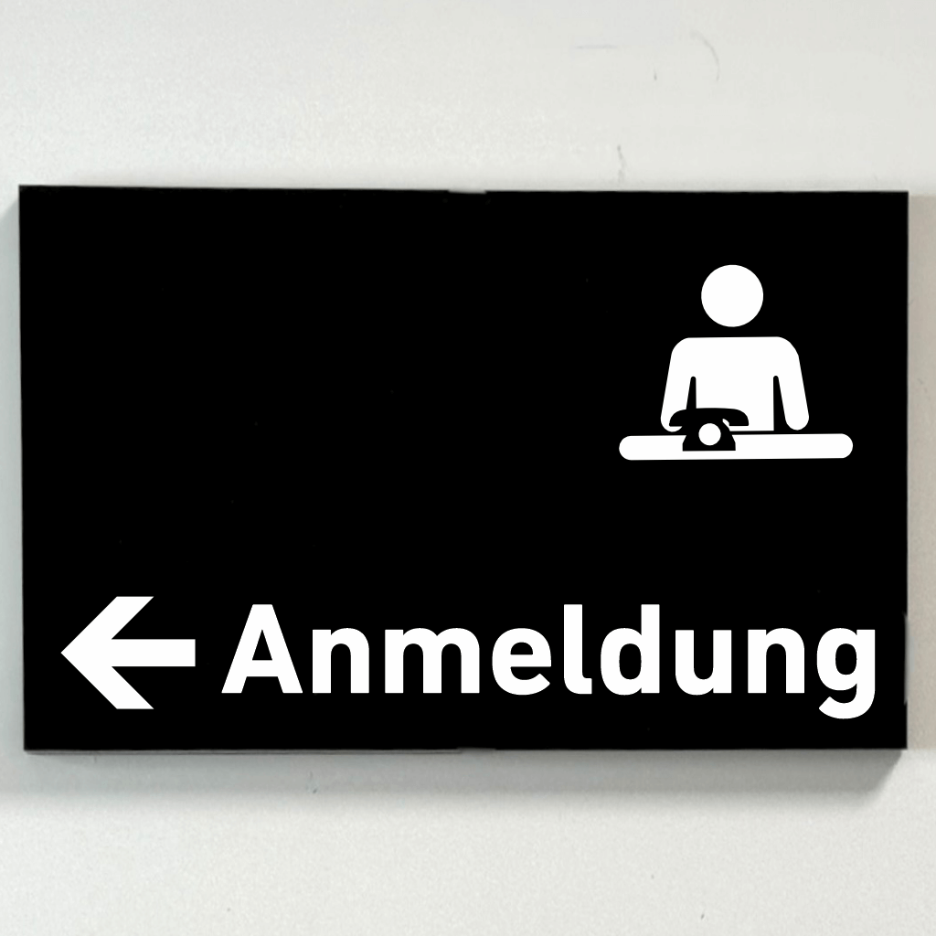 Damit jeder Besucher die Orientierung in Ihrer Praxis leicht findet, sind unsere Praxisschilder mit einem klar gestalteten Symbol versehen. Dieses Piktogramm stellt sicher, dass auch Personen, die der Schriftsprache nicht mächtig sind, den Weg zur Anmeldung problemlos finden.