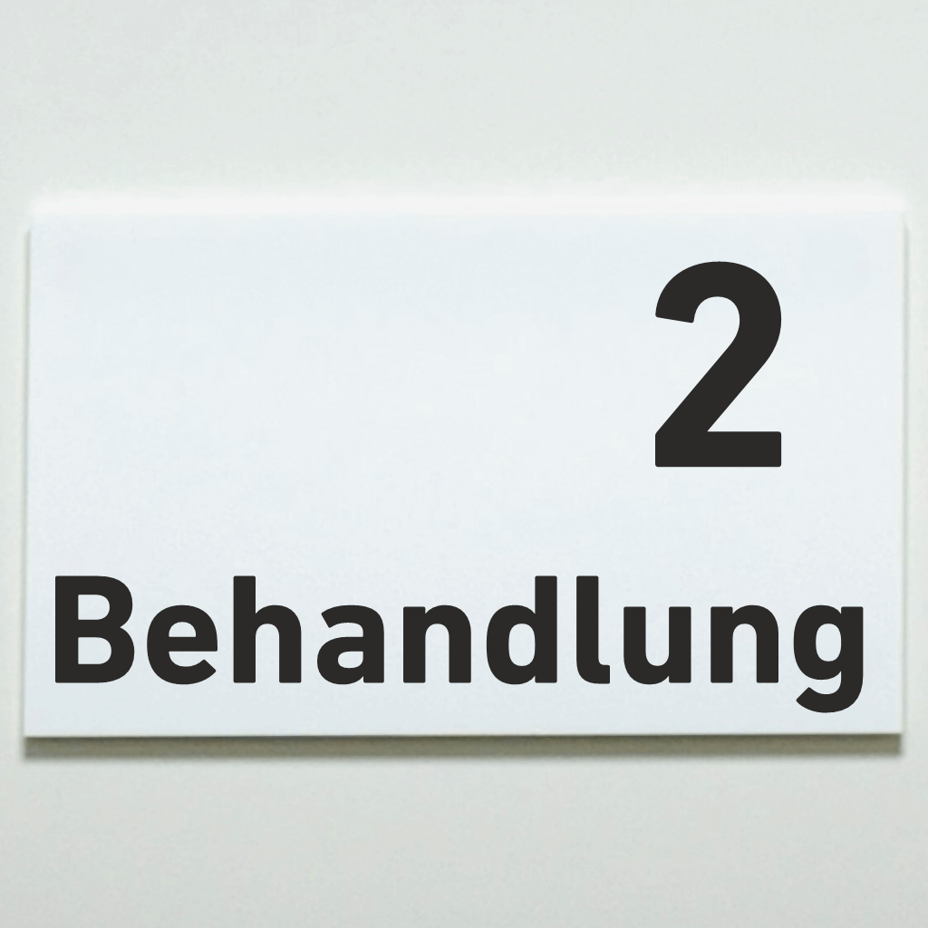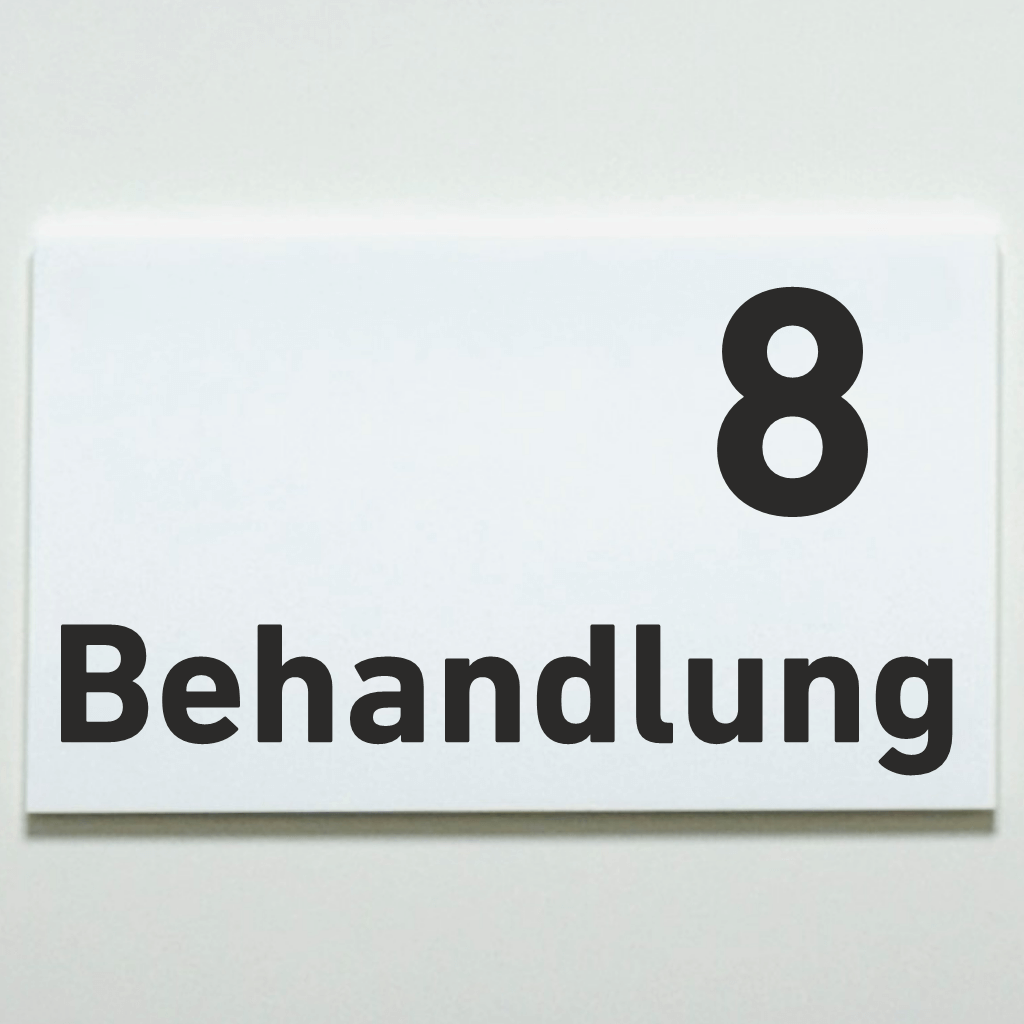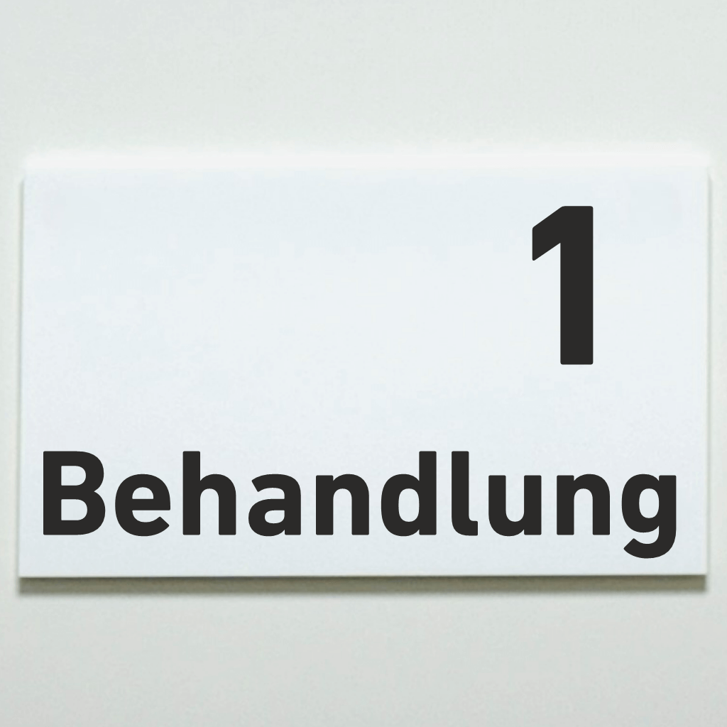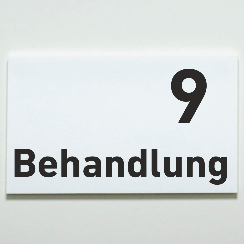 Unsere "Behandlung 1-9" Acrylglasschilder oder Folienaufkleber messen 130 x 200 mm – ein vielfach erprobtes Format, das speziell für den Einsatz in Praxen entwickelt wurde. Die Schilder sind formschön, stabil und besonders leicht zu montieren.