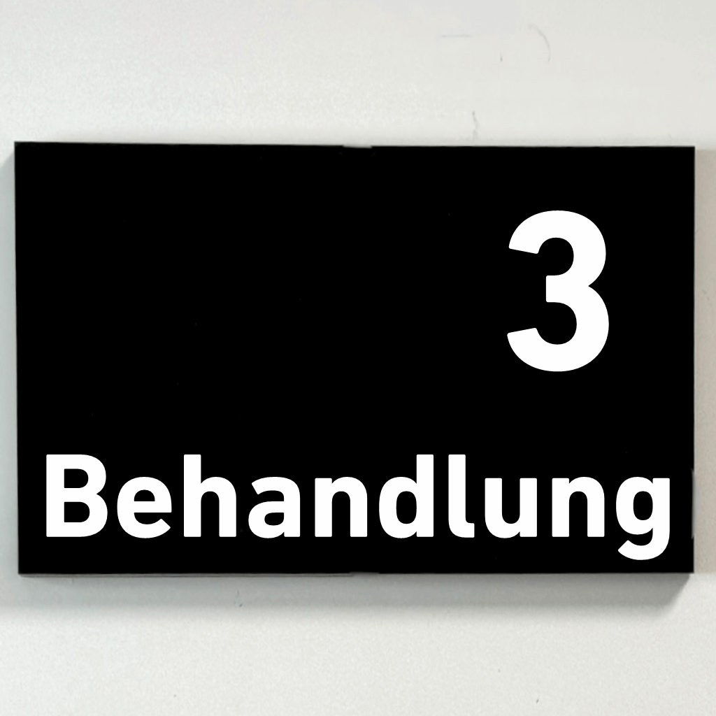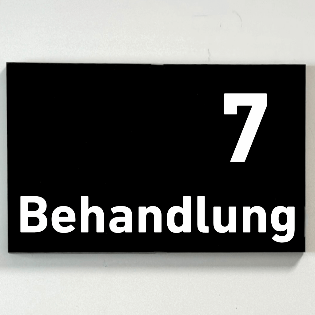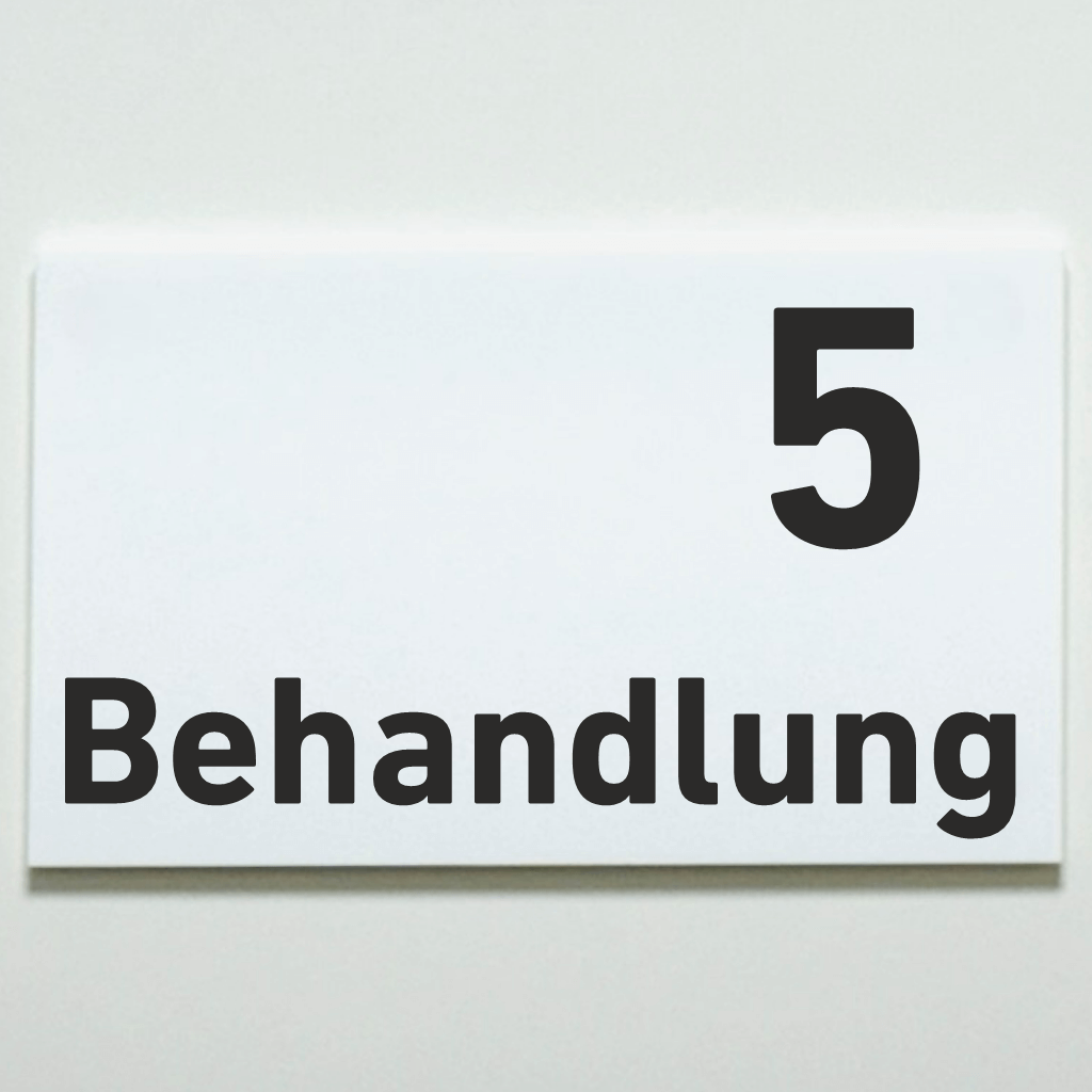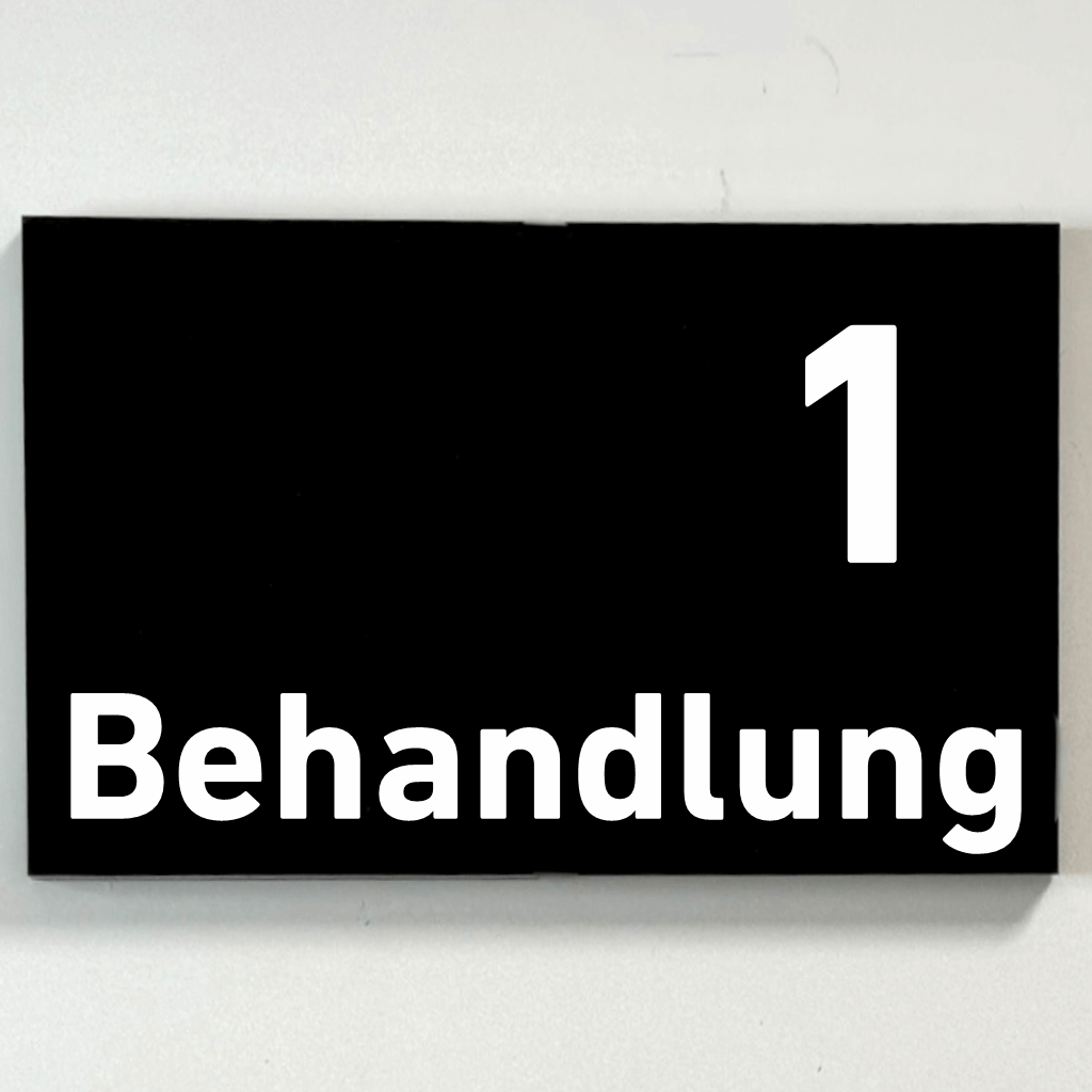 Unsere "Behandlung 1-9" Acrylglasschilder oder Folienaufkleber messen 130 x 200 mm – ein vielfach erprobtes Format, das speziell für den Einsatz in Praxen entwickelt wurde. Die Schilder sind formschön, stabil und besonders leicht zu montieren.