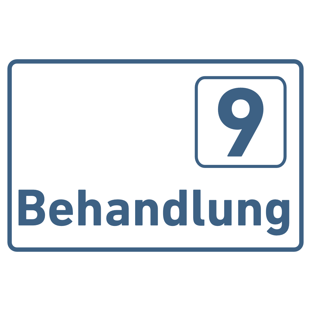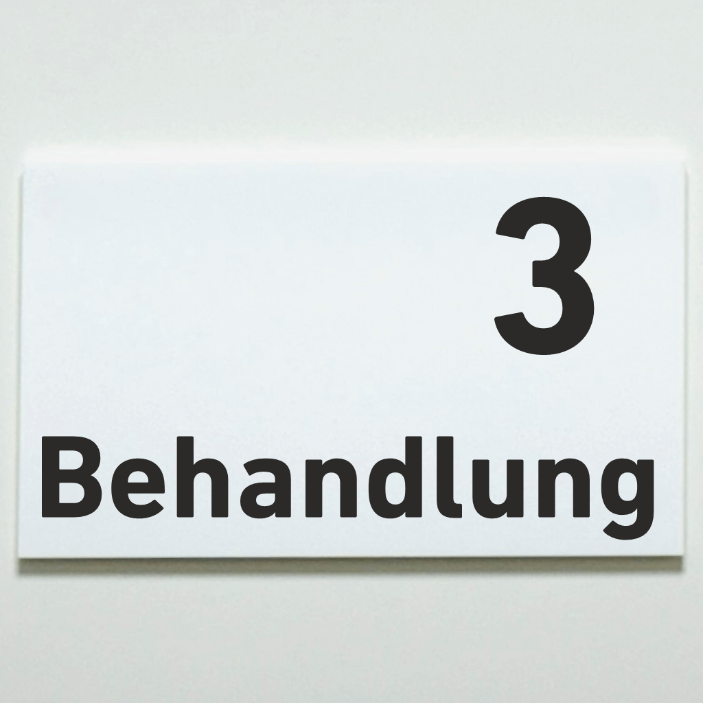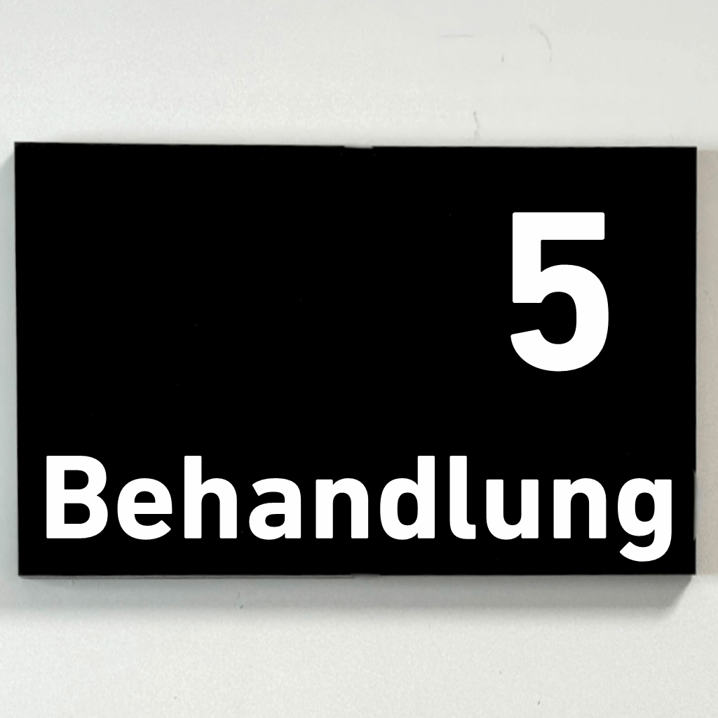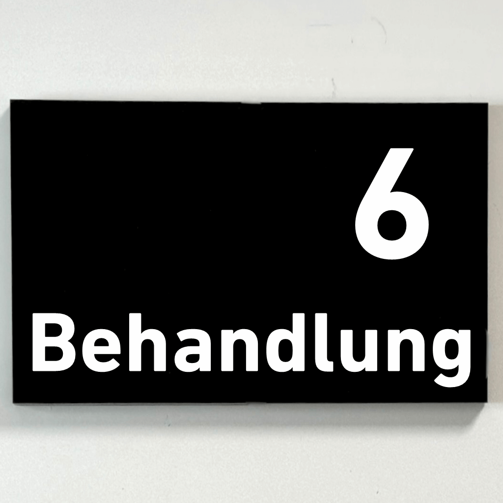 Unsere "Behandlung 1-9" Acrylglasschilder oder Folienaufkleber messen 130 x 200 mm – ein vielfach erprobtes Format, das speziell für den Einsatz in Praxen entwickelt wurde. Die Schilder sind formschön, stabil und besonders leicht zu montieren.