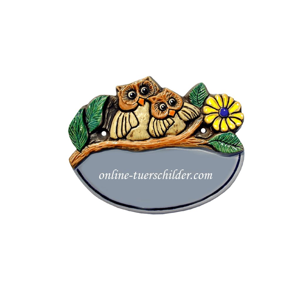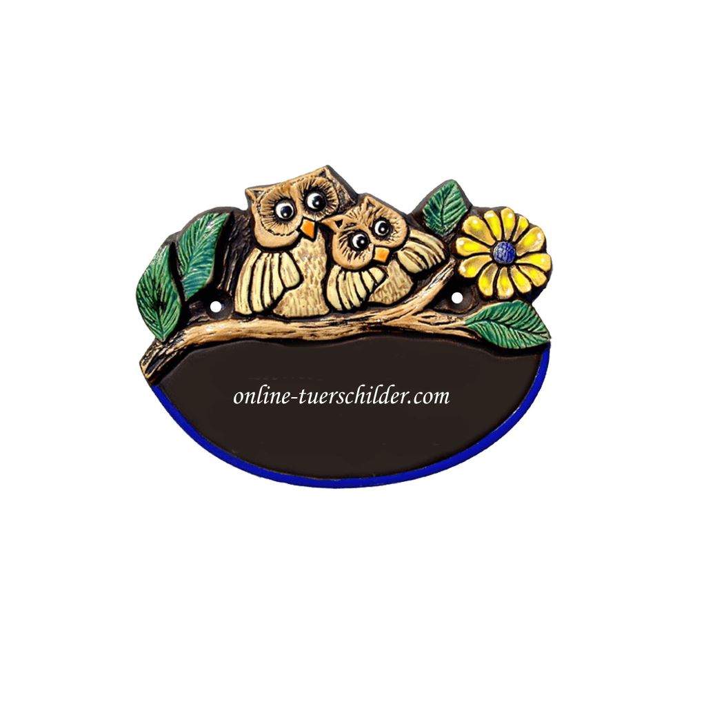 Das Türschild Motiv Eulen besteht aus glasierter, wetterfester Keramik.