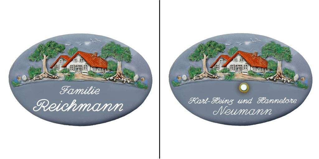 HARMONISCHES MOTIV - Das Leben auf dem Land gestaltet sich besonders grün und naturnah sowie traditionsbewusst. Urwüchsigkeit und Behaglichkeit drücken sich auf den Keramikschildern Landhaus mit Bäumen in den liebevoll bis ins kleinste Detail gestalteten Schildern aus.
